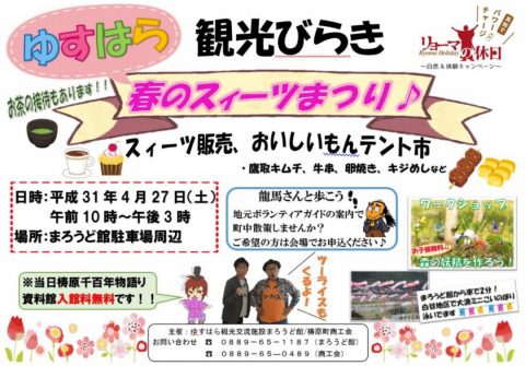 HOME > 新着情報 > ブログ > ゆすはら観光びらき ゆすはら観光びらき 4月27日は「ゆすはら観光びらき〜春のスィーツまつり〜」 龍馬さんと歩こう!&ツーライスと行く!ゆすはら散歩! ゆすはら観光は楽しいです! ぜひ坂本龍馬が脱藩した梼原町に来てください!