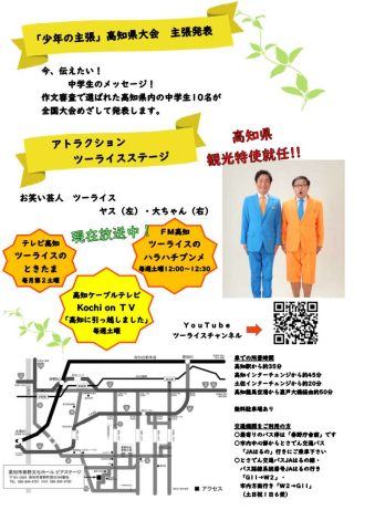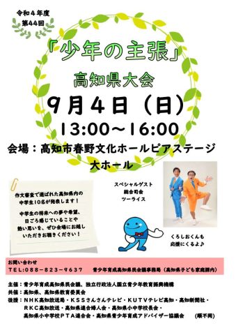 HOME > 新着情報 > イベント情報 > 令和4年度第44回「少年の主張」 令和4年度第44回「少年の主張」 令4年度第44回『少年の主張』高知県大会を開催します。 当時は我々ツーライスが司会をやります。