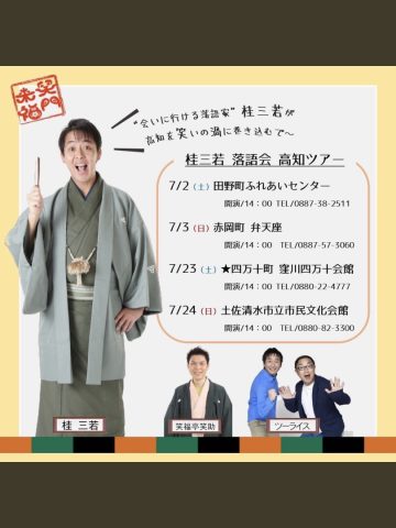 HOME > 新着情報 > イベント情報 > 「桂三若 落語会 高知ツアー」日程 「桂三若 落語会 高知ツアー」日程 やってきました! 「桂三若 落語会 高知ツアー」 7月2日土曜日「田野町ふれあいセンター」 7月3日日曜日「赤岡 弁天座」 7月23日土曜日「四万十町 窪川四万十会館」 7月24日日曜日「土佐清水市立市民文化会館」 ぜひぜひ足をお運びください‼︎
