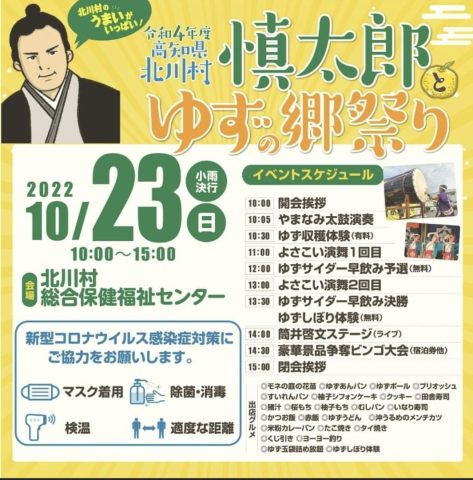 HOME > 新着情報 > イベント情報 > 10月23日「慎太郎とゆず郷祭り」 10月23日「慎太郎とゆず郷祭り」 筒井啓文とHALUが司会で 北川村「慎太郎とゆず郷祭り」を盛り上げます! ぜひぜひ10月23日は北川村にお越し下さい‼︎