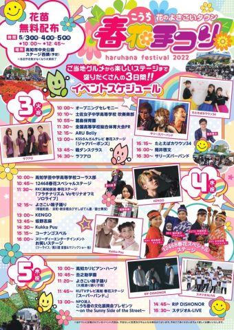 HOME > 新着情報 > イベント情報 > 5月3・4・5日『春花まつり2022』 5月3・4・5日『春花まつり2022』 毎年恒例 高知中央公園で3日間行われる 「こうち春花まつり」 今年は5月3日4日5日と行われます ゴールデンウィークは「こうち春花まつり」へ!