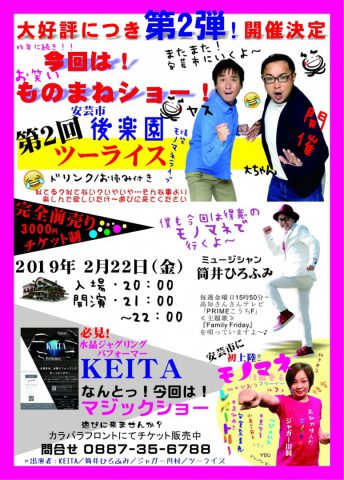 HOME > 新着情報 > イベント情報 > 第2回【後楽園】 第2回【後楽園】 2月22日は安芸市【後楽園】へ! 第2弾はツーライスと筒井啓文に今回はジャガー川村も参加して スリーディー・エンタテインメント全員で 「モノマネショー」をやりますよー!
