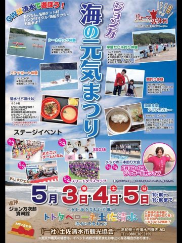 HOME > 新着情報 > イベント情報 > ジョン万海の元気まつり ジョン万海の元気まつり 5月3日4日5日は土佐清水市で 「ジョン万海の元気まつり」 3日4日は「ジャガー川村」が司会とネタをやります!!! イベント盛りだくさんの「ジョン万海の元気まつり」 土佐清水市でジャガー川村がお待ちしてます!