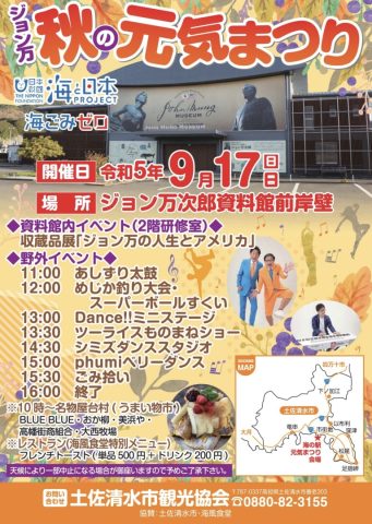 HOME > 新着情報 > イベント情報 > 9月17日『ジョン万秋の元気祭り』 9月17日『ジョン万秋の元気祭り』 9月17日 わざわざ土佐清水に来よう!!!! 屋台もいっぱい イベントいっぱい お待ちしてます! ツーライスと筒井啓文がお待ちしています!