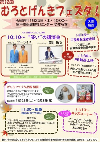 HOME > 新着情報 > イベント情報 > 11月25日『第12回むろとげんきフェスタ』 11月25日『第12回むろとげんきフェスタ』 室戸市でツーライスと筒井啓文が『笑いの講演会』をやります! 笑って健康‼︎歌って健康‼︎