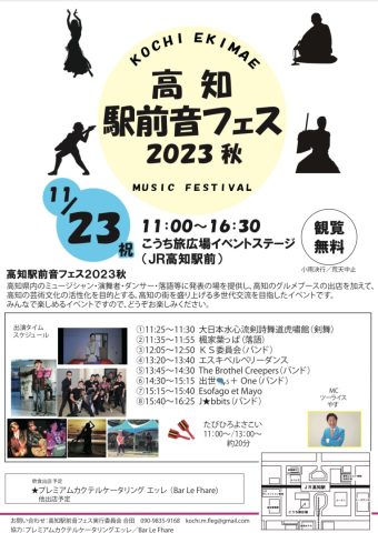 HOME > 新着情報 > イベント情報 > 11月23日『高知駅前音フェス2023秋』 11月23日『高知駅前音フェス2023秋』 高知駅前 こうち旅広場で開催します! 司会はツーライス・ヤス ぜひぜひ勤労感謝の日 高知駅前に集合です!
