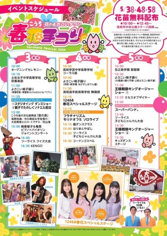 HOME > 新着情報 > イベント情報 > 5月3日4日5日第20回『こうち春花まつり』 5月3日4日5日第20回『こうち春花まつり』 今年もやってきました 『春花まつり』 5月3日4日5日と高知中央公園で開催されます 春花まつり応援大使「ツーライス」も3日間出演します イベント盛りだくさん GWは『春花まつり』にぜひお越しください