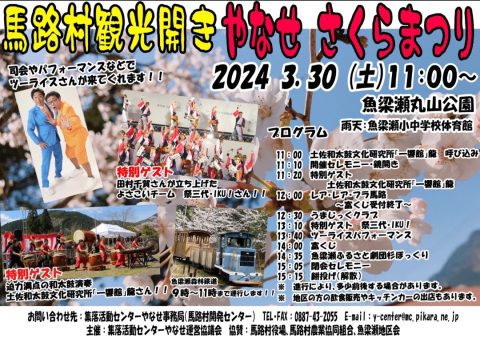 HOME > 新着情報 > イベント情報 > 3月30日『馬路村観光開き やなせさくらまつり』 3月30日『馬路村観光開き やなせさくらまつり』 桜満開 イベントといっぱい餅投げもあるよ! 遊びに来てね!