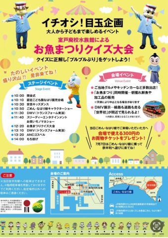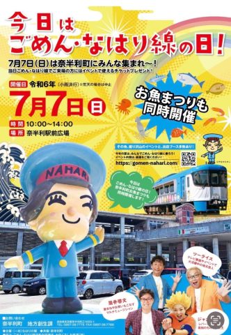 HOME > 新着情報 > イベント情報 > 7月7日『ごめん・なはり線&お魚まつりin奈半利町』 7月7日『ごめん・なはり線&お魚まつりin奈半利町』 7月7日は奈半利駅に大集合‼︎ 司会はツーライス お笑いモノマネショーに 筒井啓文&ジャガー川村 イベント盛りだくさん‼︎ 7月7日奈半利駅でお会いしましょう!