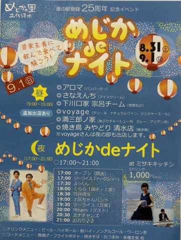 HOME > 新着情報 > イベント情報 > 9月1日『めじかde ナイト』! 9月1日『めじかde ナイト』! 土佐清水市道の駅「めじかの里」で開催されます ツーライスの筒井啓文が参加します 音楽イベントなので ツーライスも歌います‼︎ ぜひぜひ遊びに来てください!