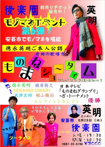 HOME > 新着情報 > イベント情報 > 8月28日安芸市『後楽園モノマネイベント第6弾』 8月28日安芸市『後楽園モノマネイベント第6弾』 久しぶりの安芸市『後楽園』でのイベント‼︎ 今回は「英明」さんがやって来ます!!!! みなさん安芸市でお待ちしています。